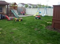 Nutrious snacks ( morning and afternoon) as well as breakfast and lunch. I am a young and energetic mom with small children myself and have been providing daycare for 5 yrs. My daycare is in a new home and we work and play in my downstairs playroom and play on the main level and also outside, with bubbles, cars, bikes, playstructure for older kids and a smaller one for toddlers (not in picture)