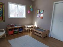 The daycare has two main playrooms. The first is a cozy main floor playroom which is ideal for the younger child. It has engaging toys and games that are rotated on a regular basis, so your little will never get bored. The second is a large gross motor room, to keep your little one active even on the rainiest of days. It has a hammock swing, mini house, ride on toys, sports activities, and padded flooring to keep your kiddo safe while running around. Additionally, the main floor family room is set up with many activities suitable for the school-aged child. The children have supervised access to a large backyard that offers much to explore.