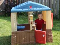 Outdoor toys include play house, cars, sand table, slide