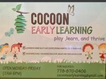 Limited part time spaces available for infants, toddlers and 3 to 5 years old. For inquiry and specific days available please email cocoonearlylearning@gmail.com or call 778 870 0406
