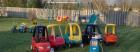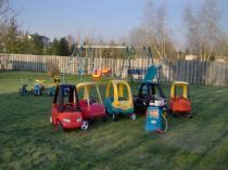 Large, fully fenced yard with play structure, swings & slide, ride on bikes and cars, lots of outdoor toys as well as activities to please the older children