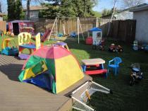 Large fenced in backyard with swings/slides/toys for play.