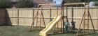 Fenced in yard for safe outdoor play with swing/slide set and toys