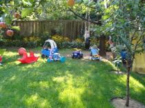We have a fully fenced beautiful big back yard with a tree house, slide, and lots of toys.